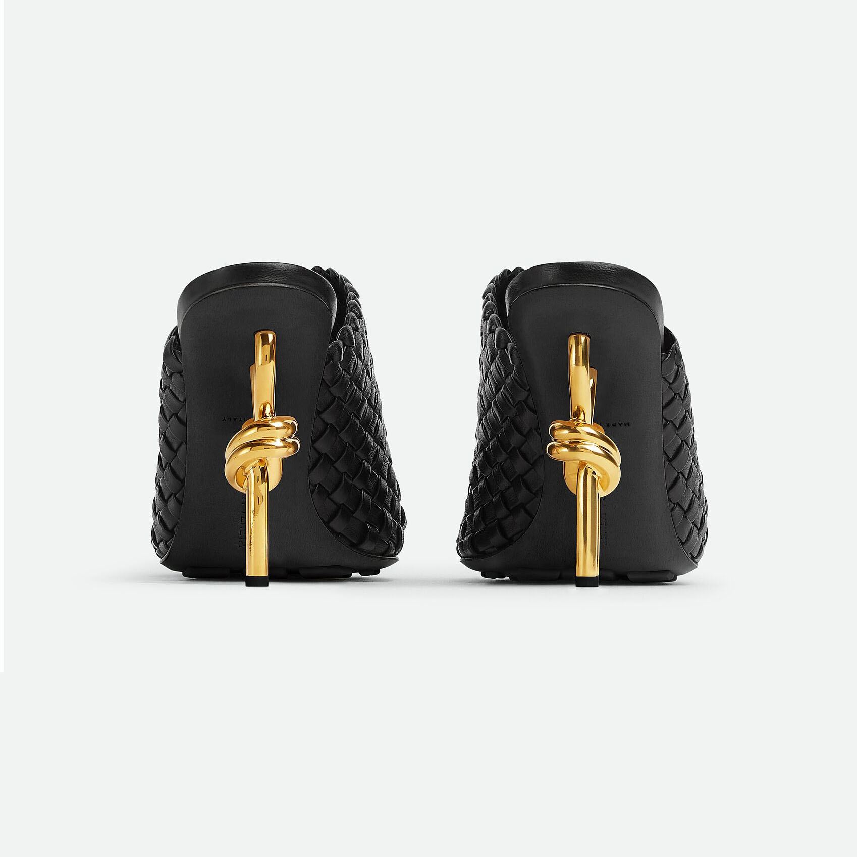 Bottega Veneta Knot Mule In Black Intrecciato Leather Mule With Gold Finished Metal Knot Heel (Heel Height 9cm)