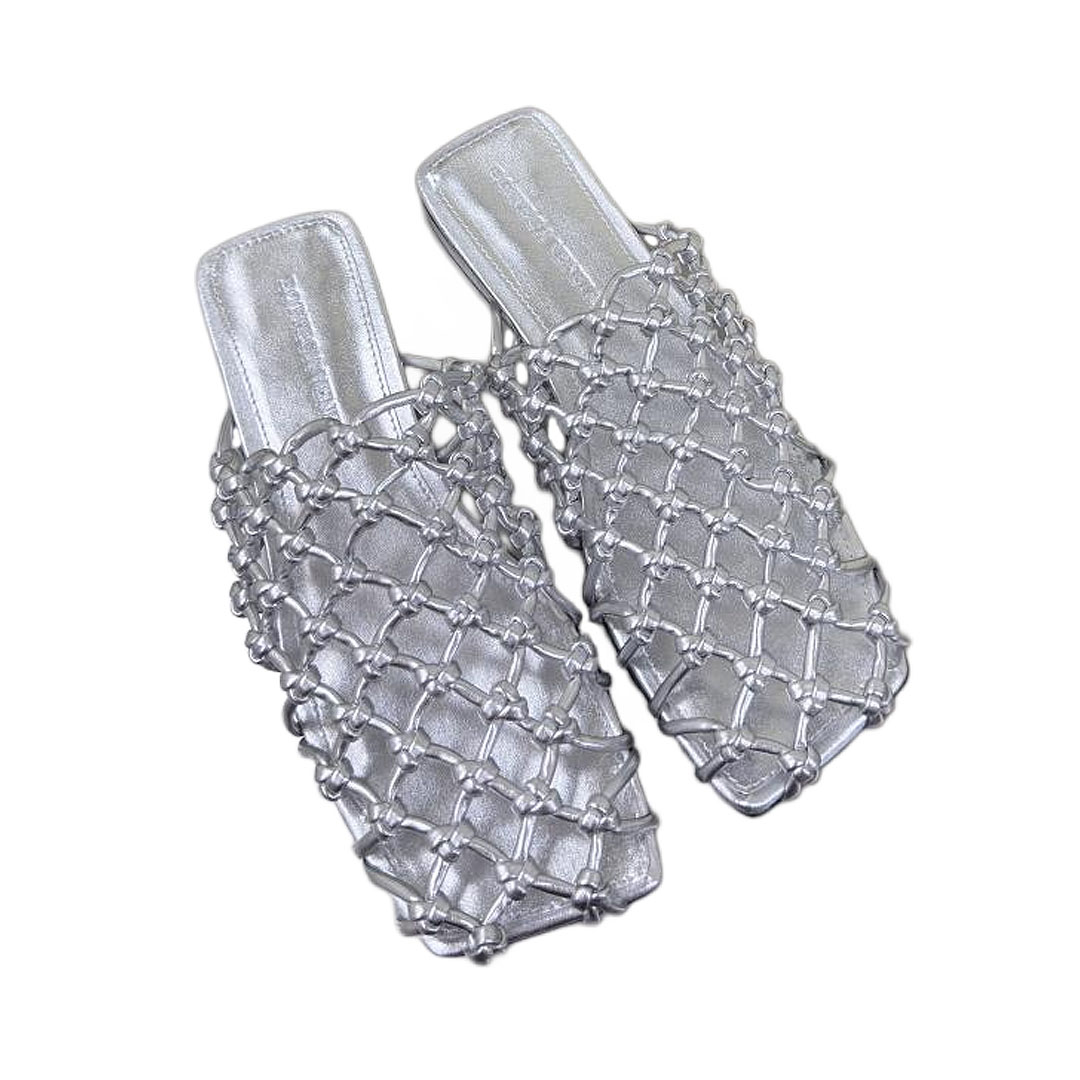 • Bottega Veneta Riva Flat Mule In Silver Woven Hand-Knotted Leather Mule Pump