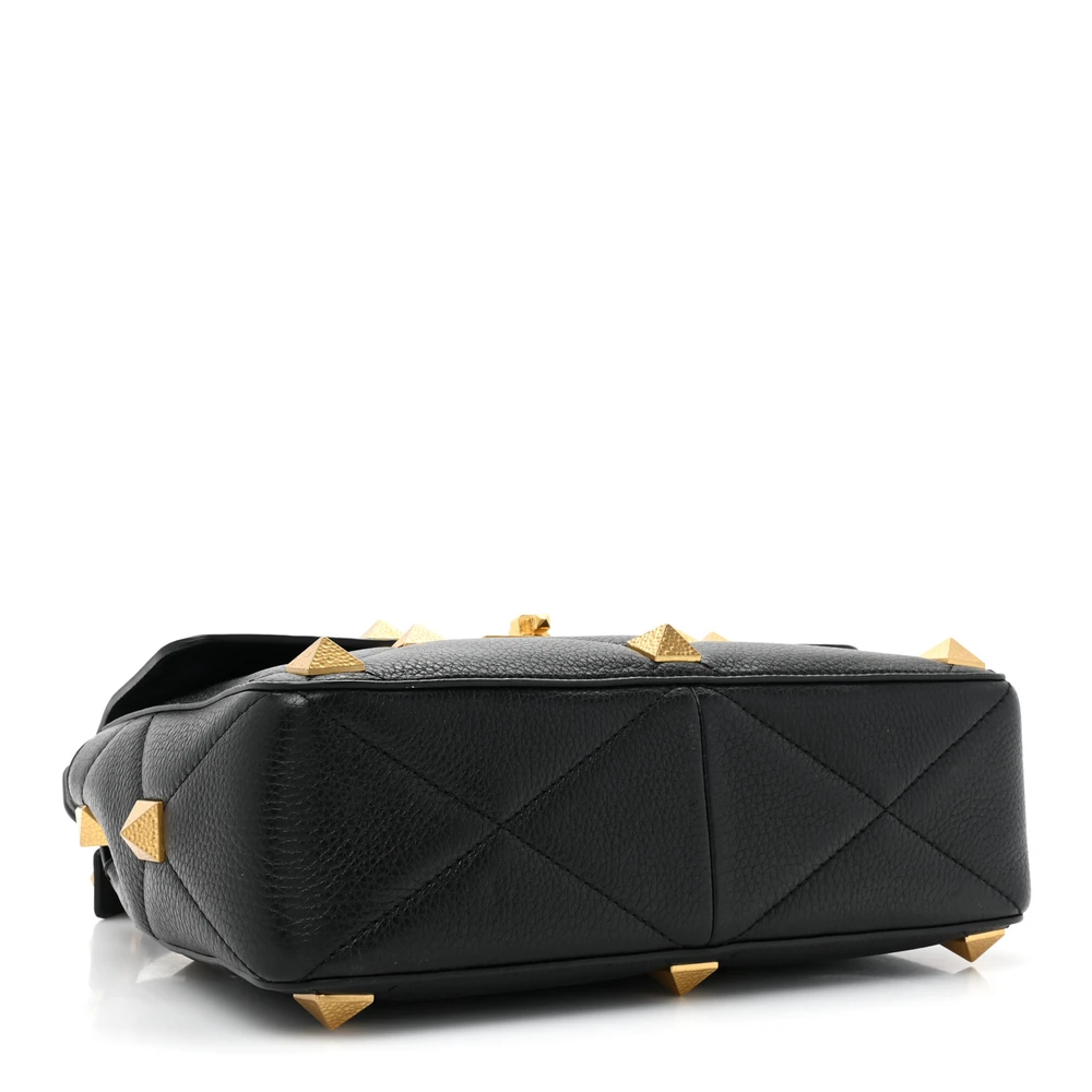 Valentino Garavani Large Roman Stud Shoulder Bag Black Grained Calfskin Leather Brass Hardware